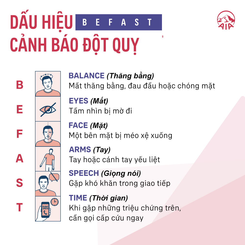 Thời gian “vàng” cấp cứu đột quỵ là từ 3-6 tiếng đầu tiên tính từ thời điểm khởi phát bệnh. Ghi nhớ đặc điểm theo công thức BEFAST dưới đây để có những hành động kịp thời nhằm giảm thiểu nguy hiểm và những biến chứng để lại sau này.